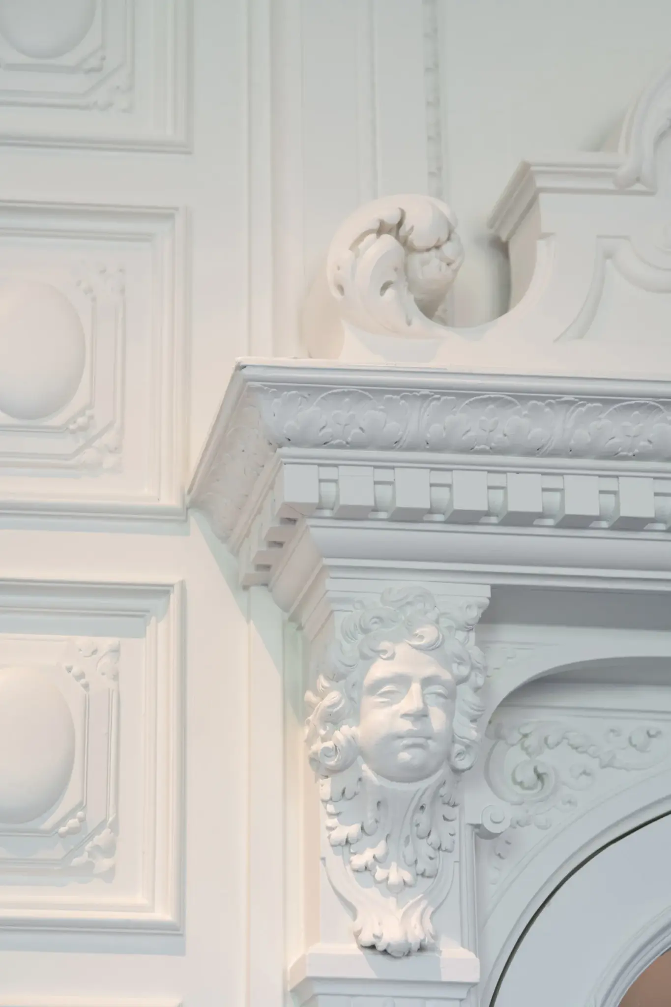 The décor features a restrained color palette and incorporates natural materials. This approach maintains the focus on the room’s scale and original details, such as the carved fireplace inspired by the Palace of Versailles. Together, these elements create a seamless flow from the dining room to the living area.
