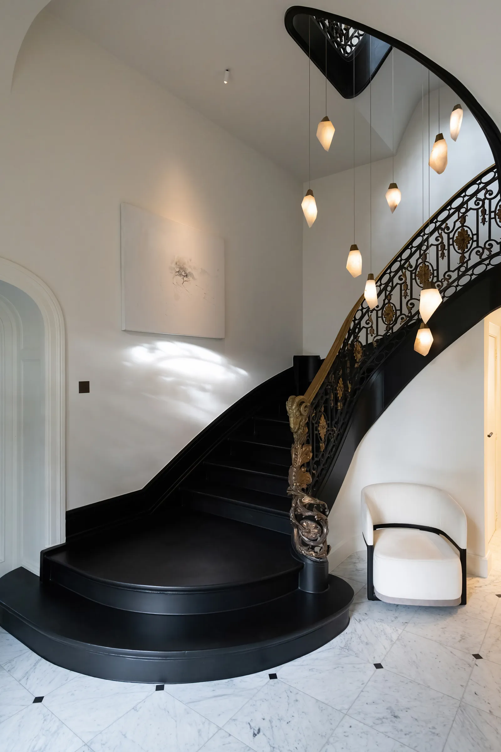 As you step into the home, the staircase immediately draws your eye. Its grand curve and intricate wrought iron railing bring a sense of old-world charm. Modern pendant lights cascade above, creating a sculptural effect that feels both elegant and contemporary. The black steps contrast beautifully with the light marble floor, adding depth and drama to the space. This thoughtful design sets the tone for the rest of the interiors, including the dining room decor ideas that follow.