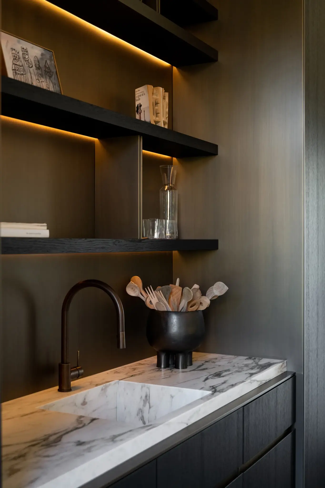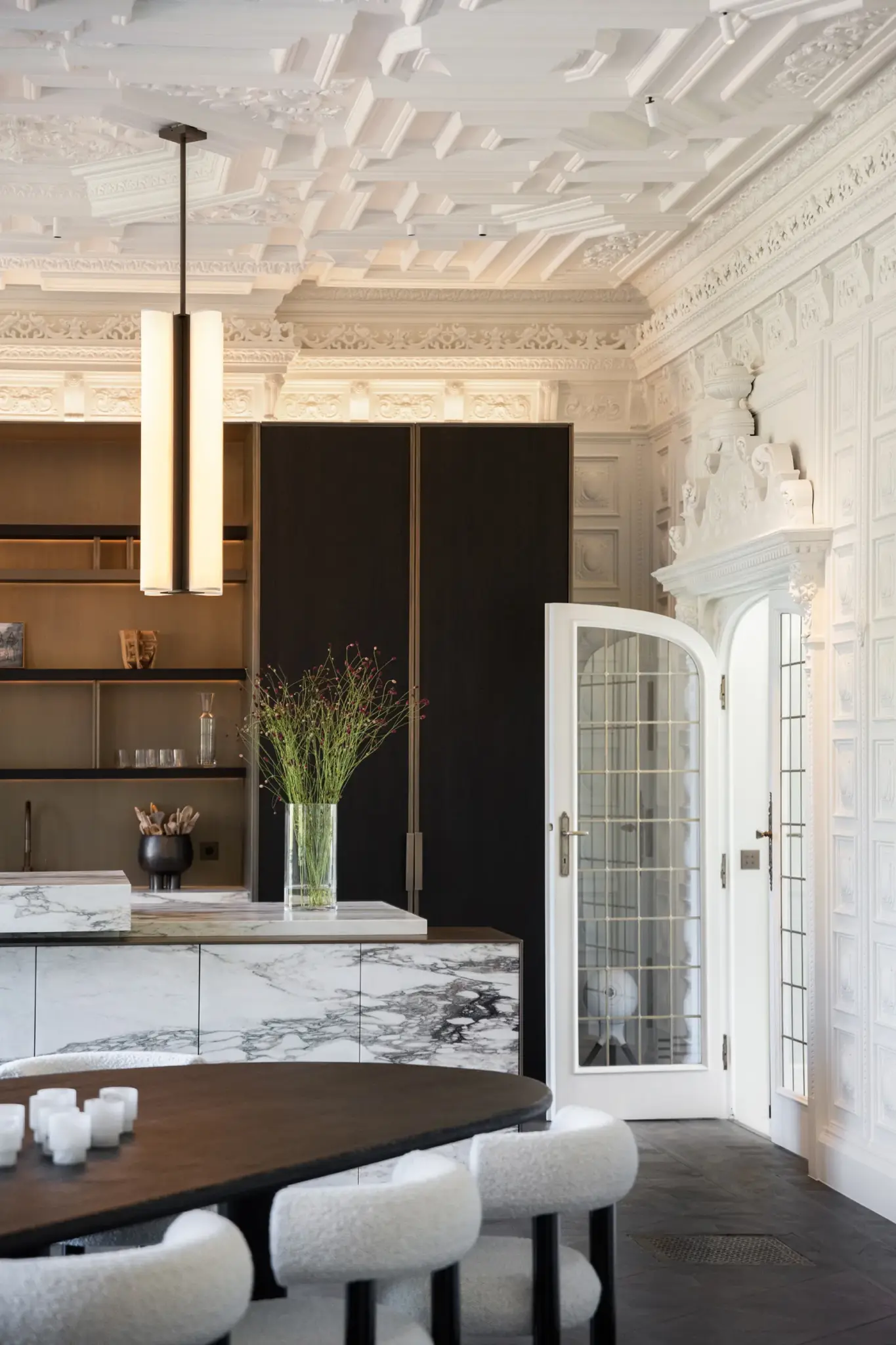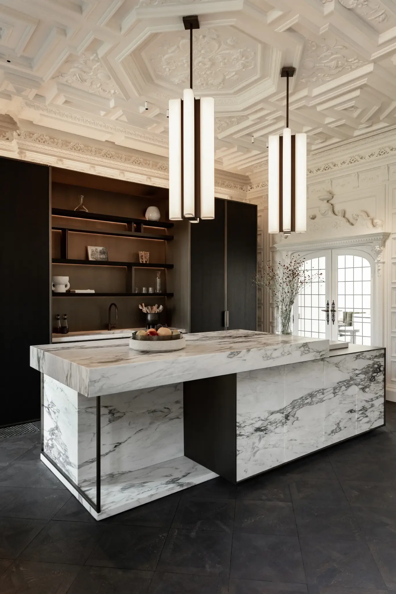 At one end of the dining room is a show kitchen. It is designed as a visual masterpiece, with dark-stained oak, bronze, and Calacatta Vagli marble. These luxurious materials create a sense of warmth and sophistication. The kitchen island and cabinets appear to be freestanding furniture rather than built-ins.