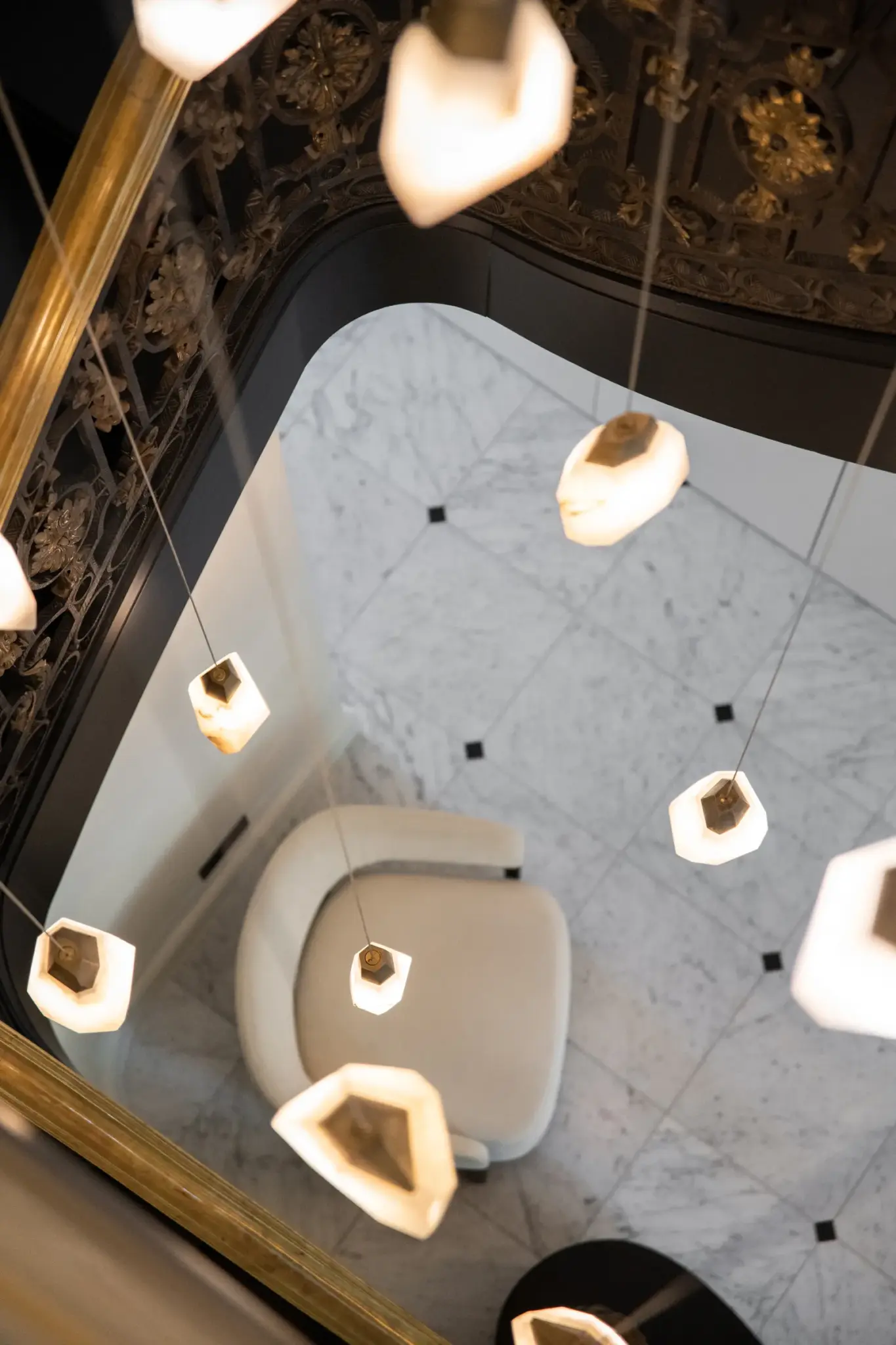 A custom dining table anchors the space. It is large and placed diagonally, creating a sense of movement and contrast. The table is paired with elegant chairs and a sculptural centerpiece of alabaster candleholders. Above, pendant lights by Roll & Hill add a soft glow that enhances the ambiance. These dining room decor ideas strike a balance between grandeur and simplicity, making them perfect for both family meals and lavish dinner parties.
