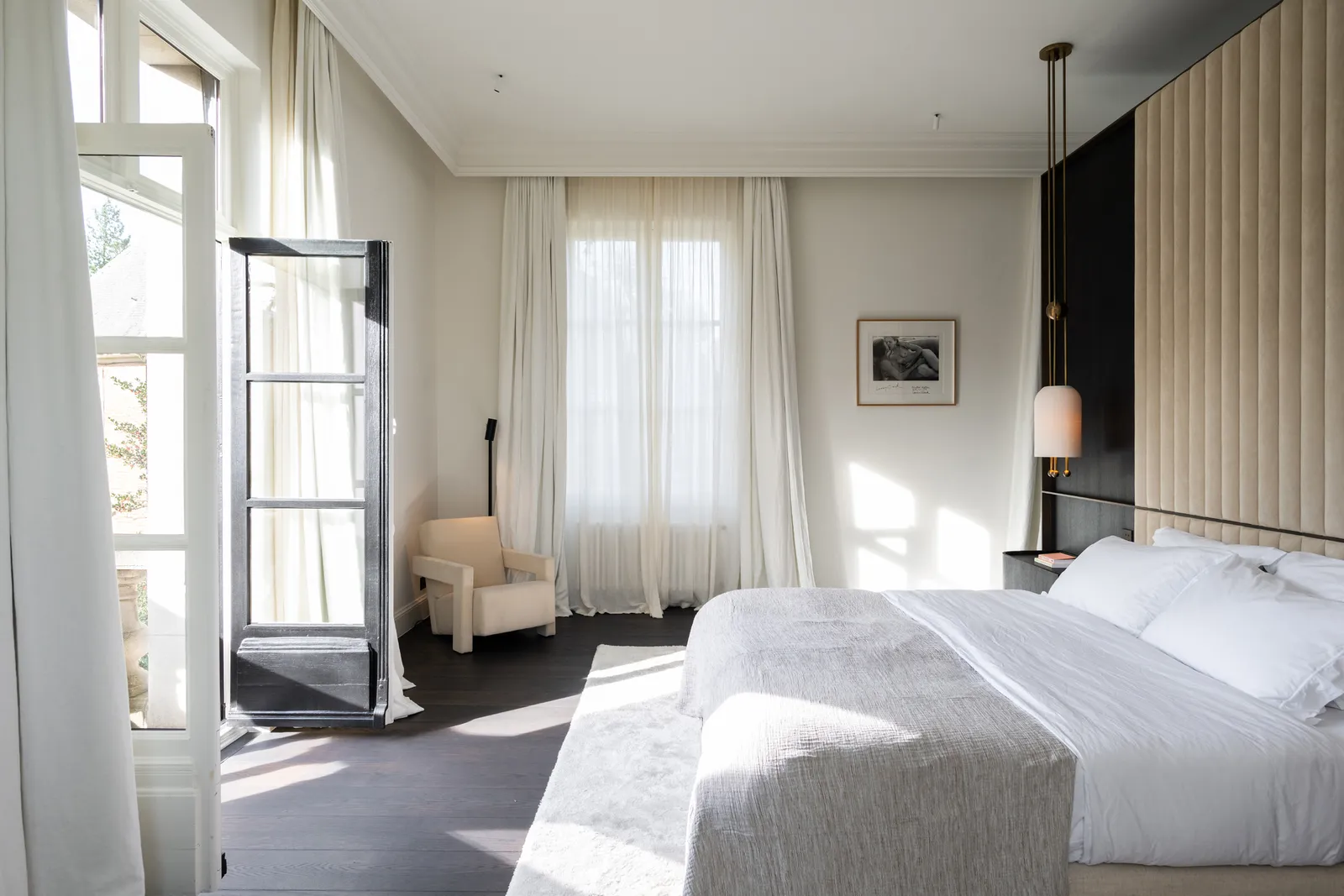 The bedroom captures the essence of quiet luxury with its minimalist design and soft, neutral palette. Light streams in through tall windows framed by elegant white drapes, creating a serene atmosphere. The bed, dressed in crisp white linens and a textured gray coverlet, invites relaxation.