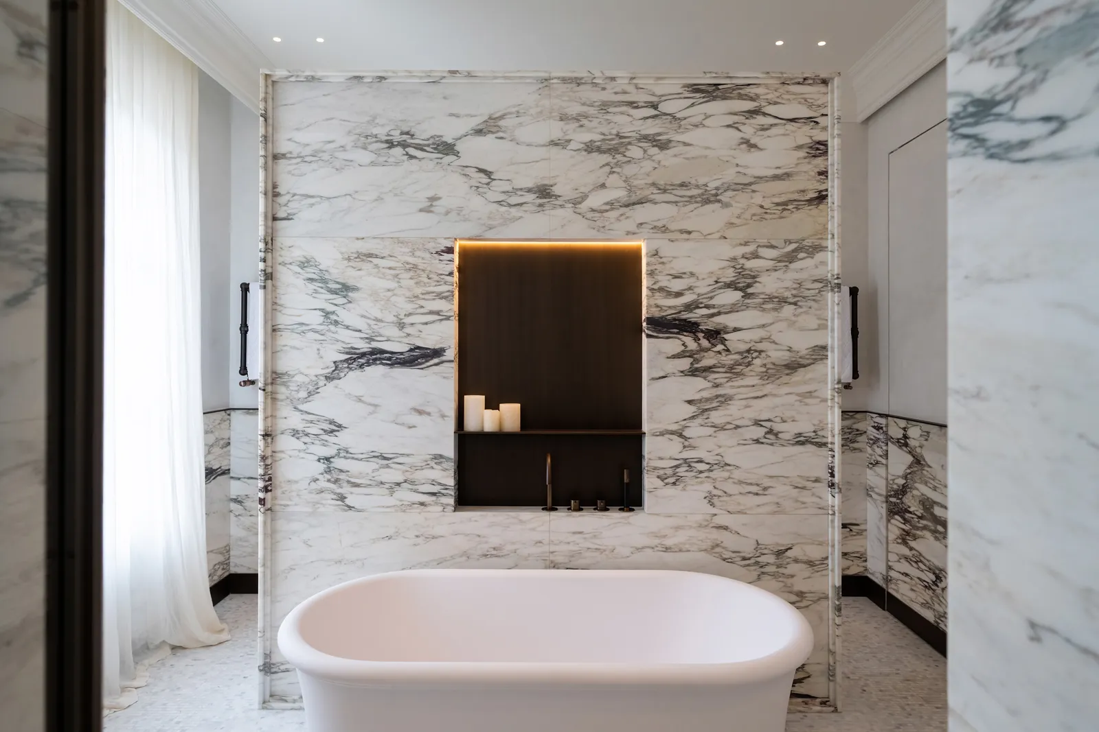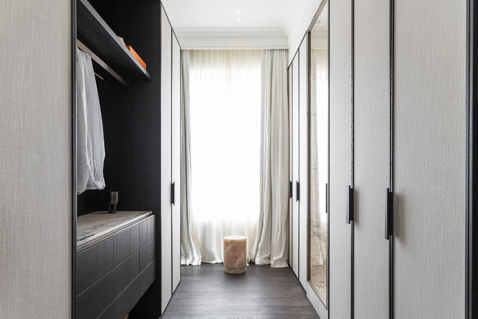 .While the public rooms shine, the private areas are equally refined. The principal bedroom features soft taupe suede and warm lighting, creating a restful ambiance. Behind a custom headboard lies a hidden dressing room with linen-paneled doors and marble details. The bathrooms echo this design language, with Calacatta Vagli marble and minimal accessories for a spa-like effect.
