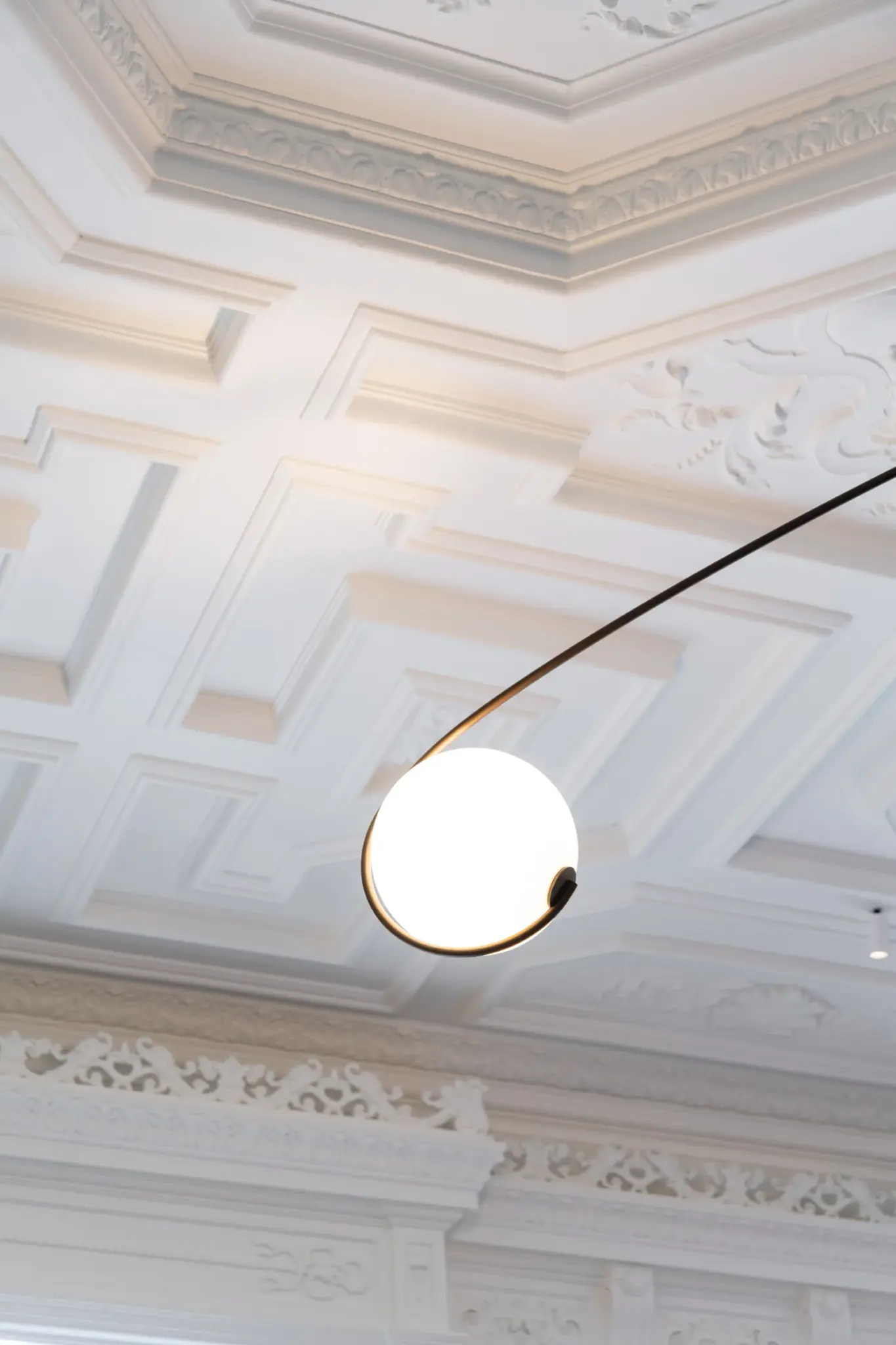 The dining room is the heart of the home. Here, antique details meet sleek, modern touches. The architect, Dieter Vander Velpen, restored the original parquet floors and ornate ceiling carvings. The walls were painted white to enhance their beauty. This light, neutral backdrop allows the detailed woodwork to stand out while keeping the room feeling fresh and open.