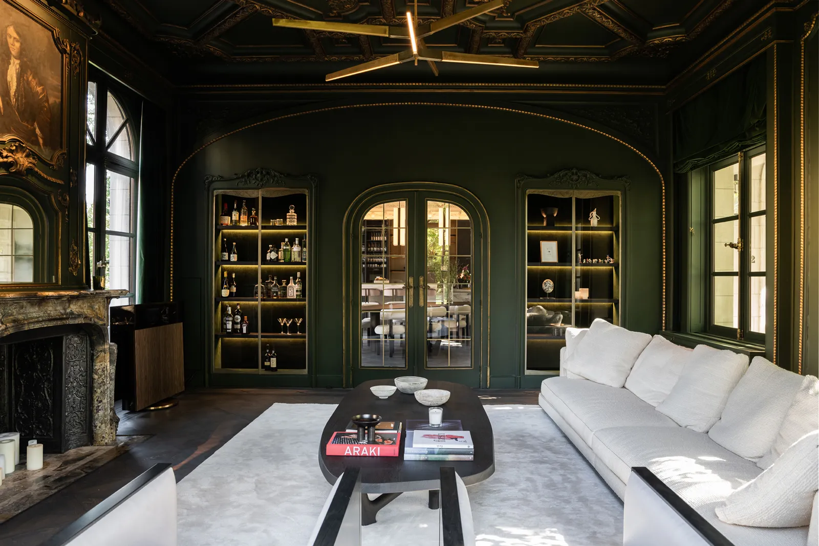 Next to the dining room, the living room invites relaxation. Painted in a rich, deep green, the space contrasts with the lightness of the dining area. The mood is intimate and perfect for evening gatherings. Modern furniture, such as a sculptural bronze stool and a Maxalto sofa, brings contemporary energy to the space. A portrait of the château’s former owner nods to its history.